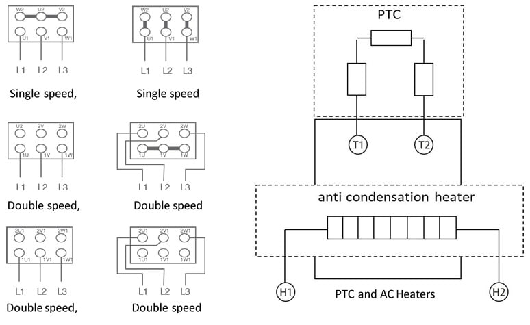 Our motors are generally connected in delta (Δ) from 3 kW to allow star-delta (Y/Δ) starting at a line voltage of 400V. On request and for particular applications, depending on the power and supply voltages, the motors can be star-coupled (Y). Wiring diagrams are shown below.